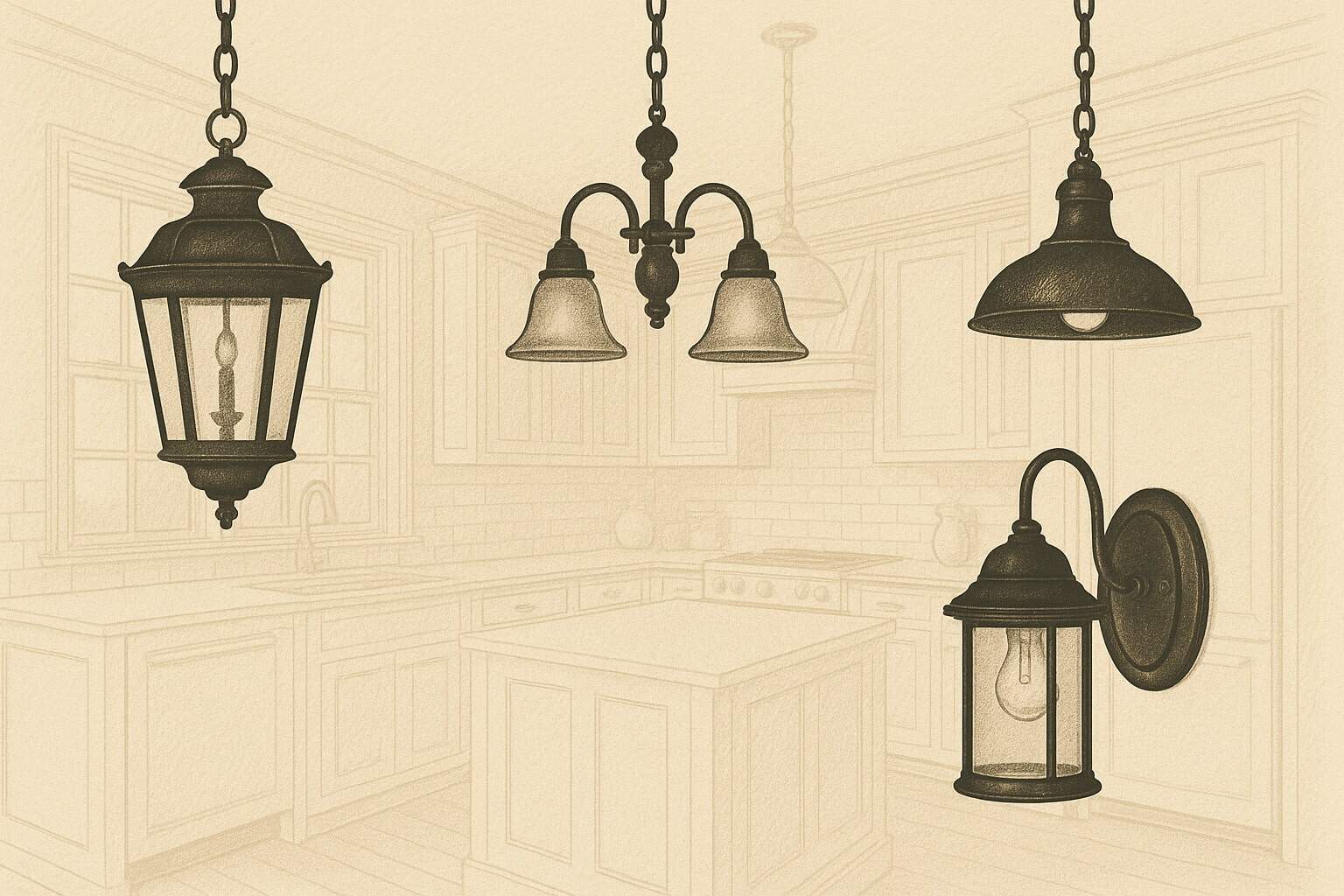 Antique lighting spans many forms, each with a natural “best use” in a kitchen. Pendants concentrate light precisely; lanterns and chandeliers make statements; sconces layer in at eye level; semi-flush mounts keep low ceilings feeling tall.